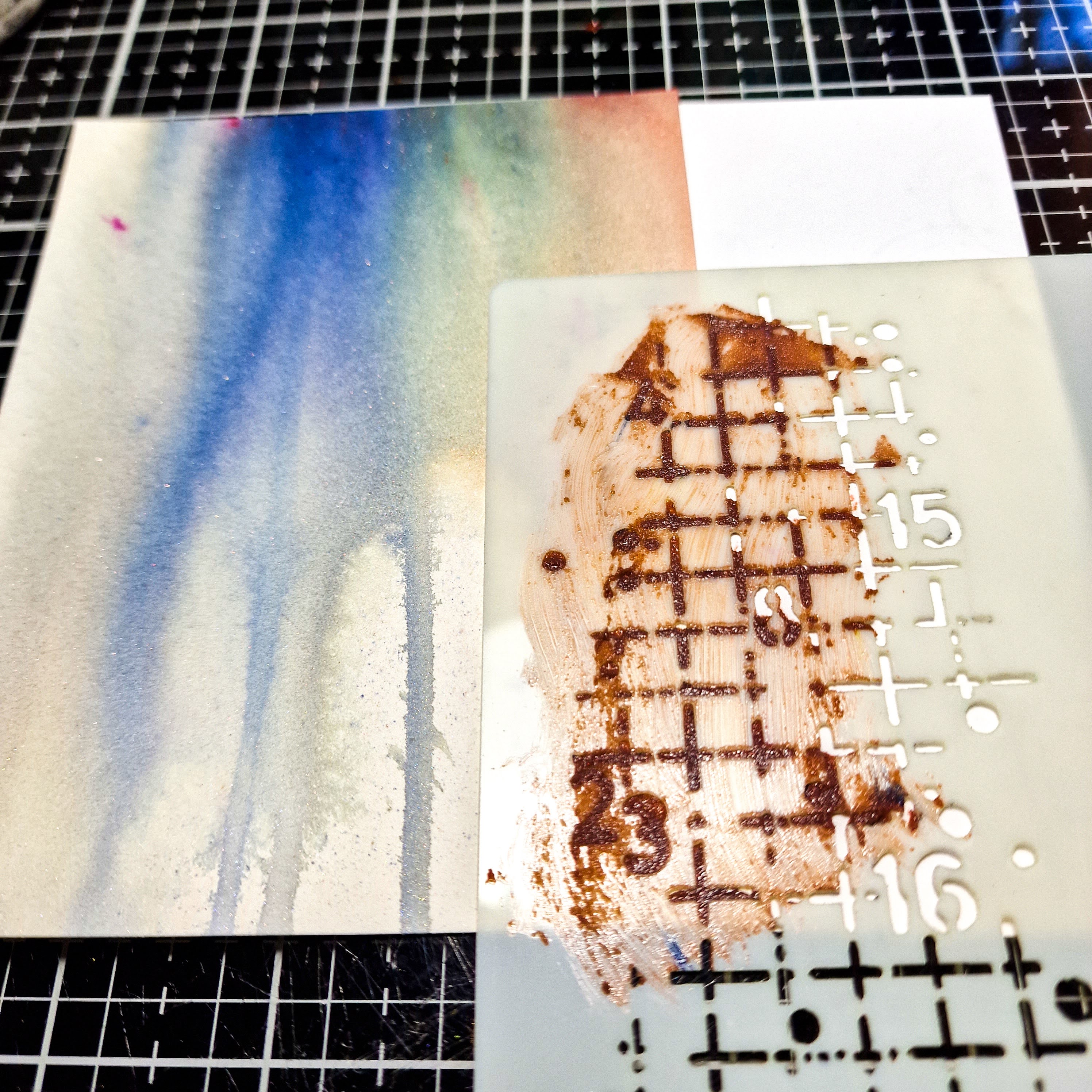 Off the Grid Stencil and placed it slightly off the bottom right side of the dried watercolour paper and added the texture paste and repeated the same on the upper left side of the watercolour. One of the great things about this stencil, is that it is 3 for 1. That means that you don't get just 1 image on the stencil, as is usually the case....you get 3 fabulous designs on it!